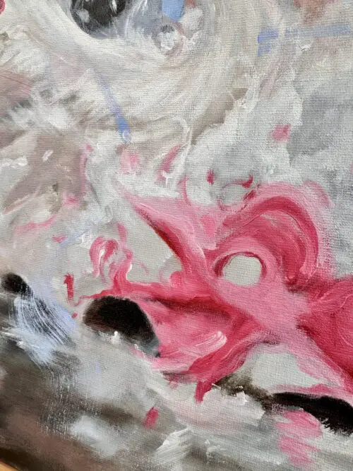 In Pesch’s werk wordt de grens tussen droom en werkelijkheid vervaagd, waardoor de kijker wordt meegenomen naar een wereld waar abstractie en realisme elkaar ontmoeten. Dit samenspel geeft elk stuk een gevoel van intrige en nodigt de kijker uit om zijn wereld van kleur, verbeelding en tot nadenken stemmende symbolen binnen te treden.