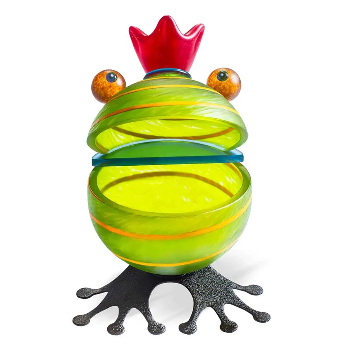 The thick-walled glass bowl reflects high-quality craftsmanship, while the solid glass eyes and crown give the frog its distinctive character. The sandblasted surface impresses with its velvety matte finish. The powder-coated steel feet are finished in a matte dark olive and equipped with small felt pads – ensuring a stable stand without scratches.