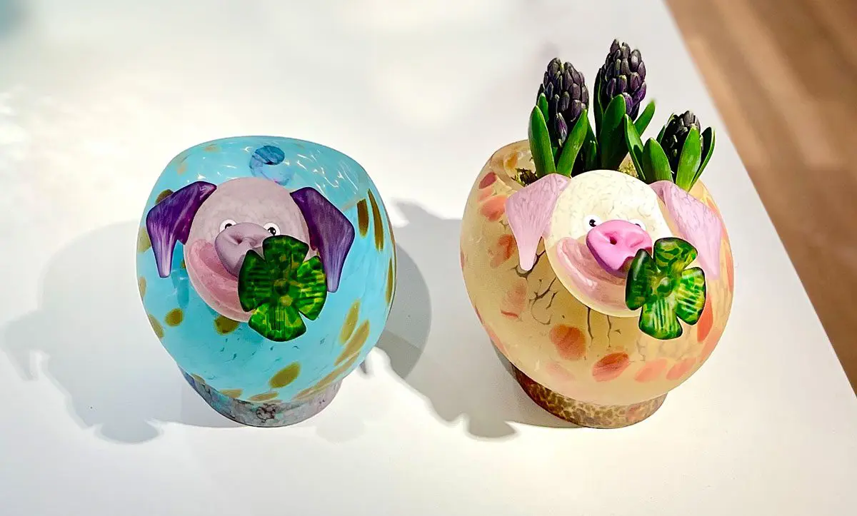 Lucky Pig with a lucky clover in the happily grinning corner of his mouth. Give the gift of luck with this lucky pig made of high-quality glass!