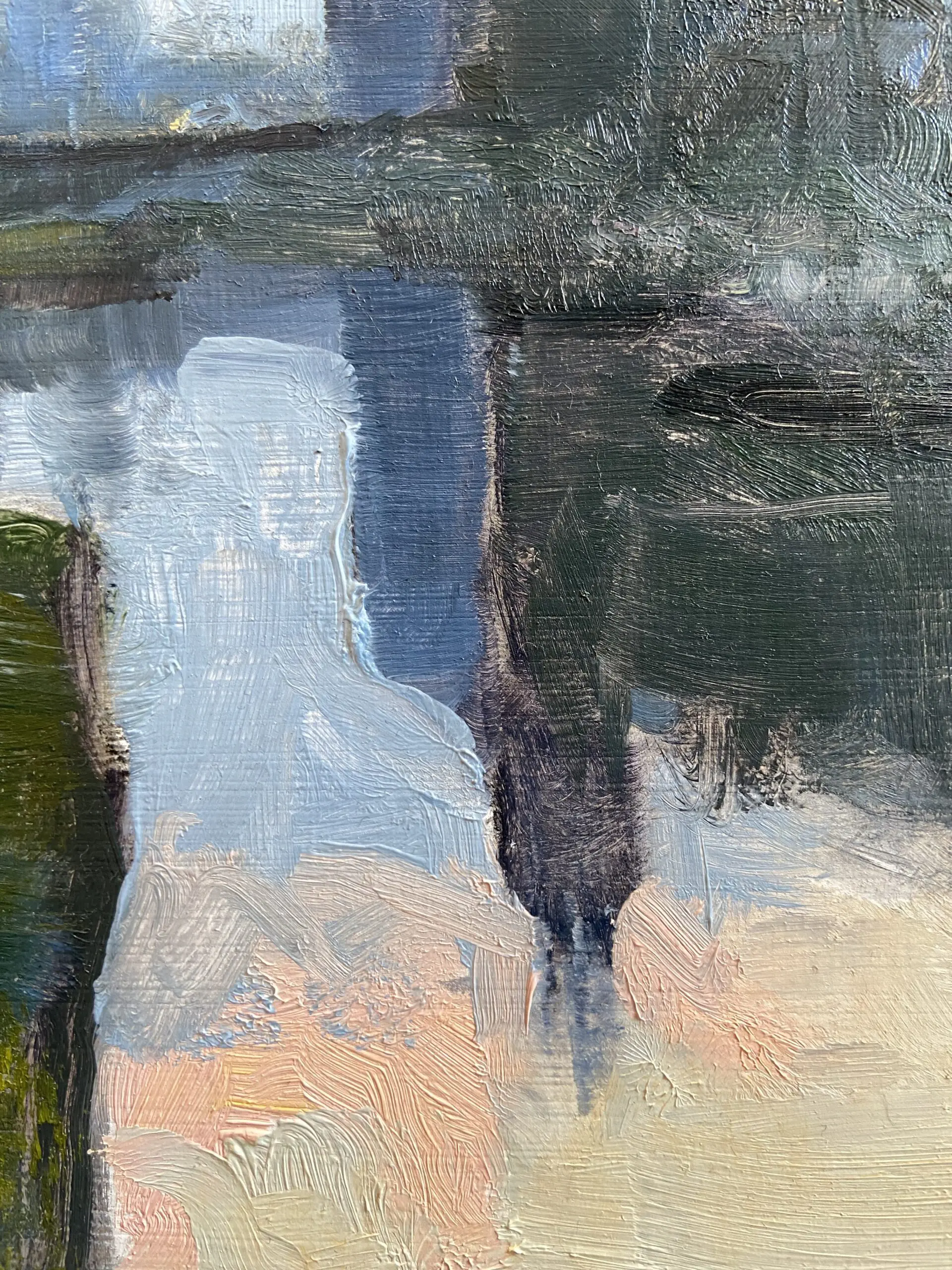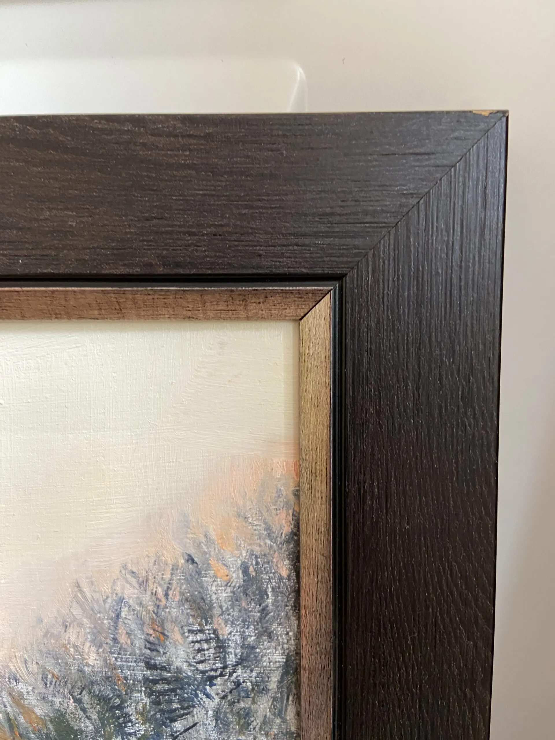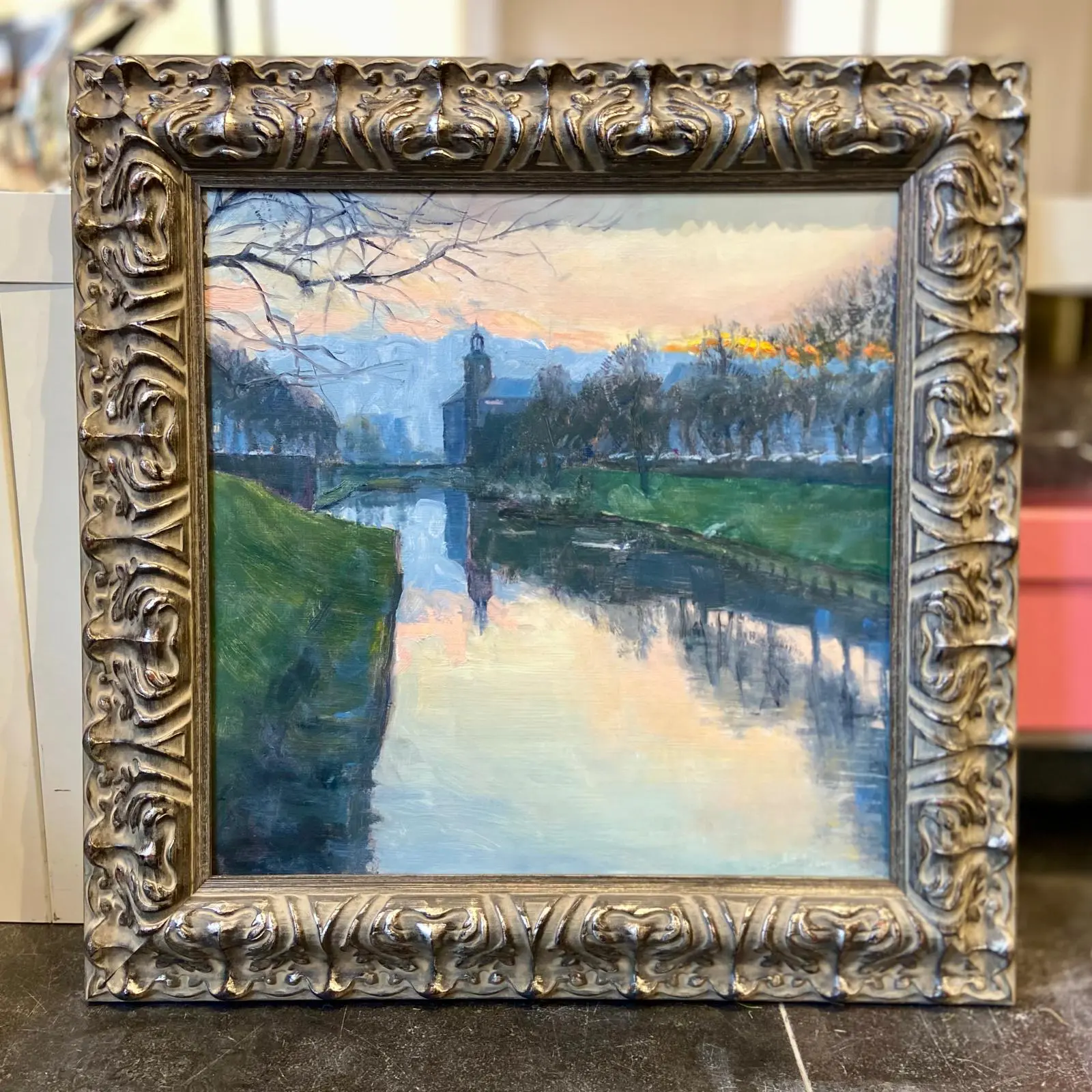 Olieverf op linnen in handgemaakte houten ornamenten lijst.