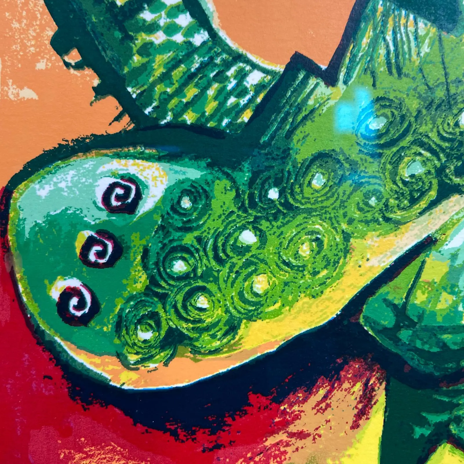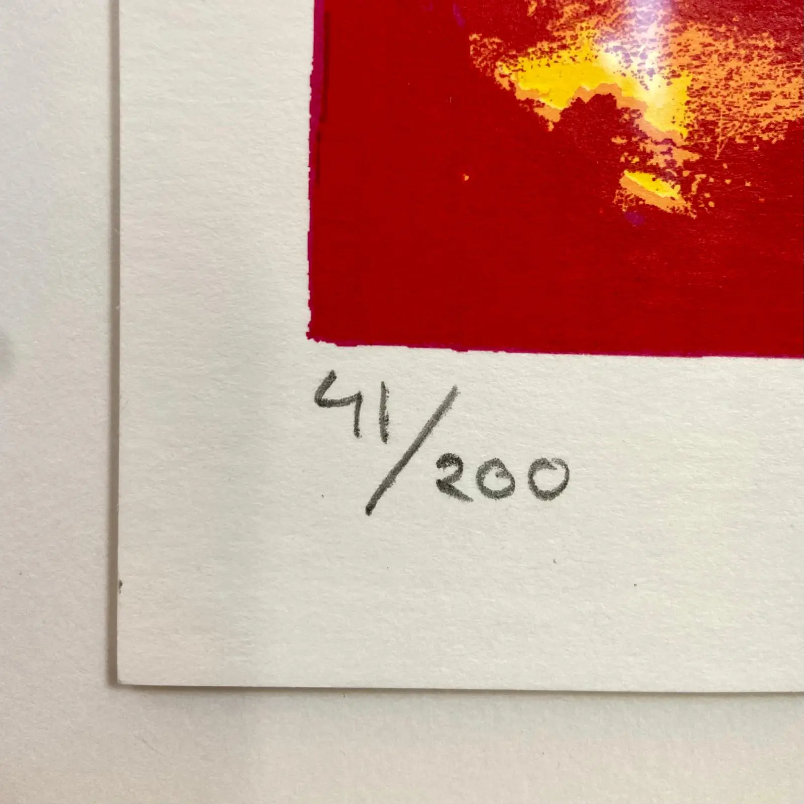 Kleurrijke zeefdruk uit een serie van 4. Gemaakt op handgeschept papier en mooi ingelijst.